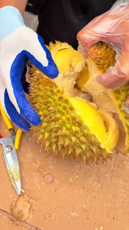 泰国金枕随手开验,A果出肉率惊人,皮薄肉厚,干包黄肉!#泰国金枕#榴莲#小鹿供应链#东莞批发