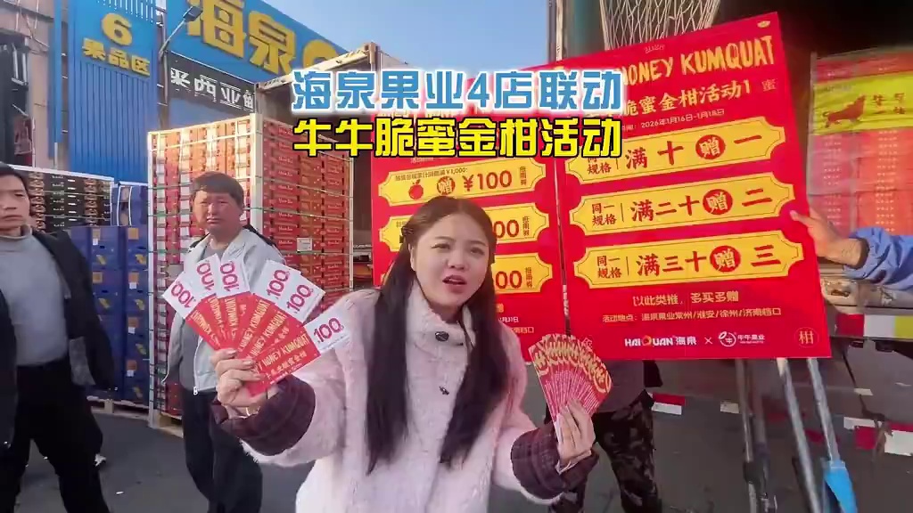海泉果业4店联动,优惠活动继续来袭!牛牛脆蜜金柑产地直发 整挂到家! 买十送一,买二十送二,以此类推!多买多赠!活动时间:2026年1月14日开始,欢迎大家来参加活动哦!超级划算的优惠活动!千万别错过!